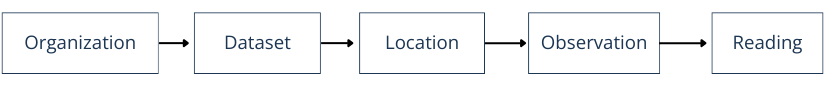 - Each element (organization, dataset, location, observation, reading) has its own unique reference (a UUID) that will not change