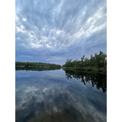 Anchored to test waters in between two small uninhabited islands in back channel of the Upper French River just north of Elliot Island. Some natural debris and foam. Average water level, slow water flow. Clear and odourless water sample. Boating and fishing zone.