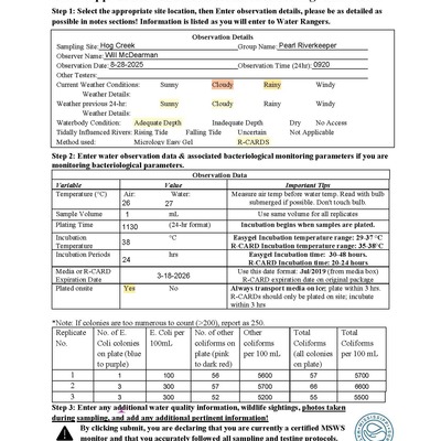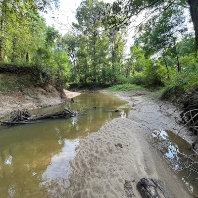 The Hog Creek test site is in the Fannye A. Cooke Natural Area (FACNA) managed by Wildlife Mississippi with restricted access. Wildlife Mississippi for 2022 currently has granted permission only to Will McDearman with Pearl Riverkeepers (PRK) for access and testing. Wildlife Mississippi in the future may entertain requests for permission to other PRK volunteers, but that future point has not yet been reached. Coordination with Libby Hartfield, Wildlife Mississippi Education Coordinator, is essential to understand when conditions may be appropriate for additional requests to James Cummins, Executive Director. Access requires the gate padlock combination at the main gate and one additional side gate. The main gate is located on Liberty Road 0.34 miles from the intersection of Lakeland Drive. On Liberty Road from Lakeland Drive, turn left onto gravel drive to the gate. Unlock padlock with the combination, pass, and lock the main gate before continuing. On gravel road continue 0.36 miles to the first road on the left with gate. Unlock padlock on gate, pass, and relock the gate. Proceed down gravel road that, at 0.63 miles, curves to the right and will pass a gravel parking area on the right. The road will then curve to the left and descend to a lower Pearl River floodplain terrace. Cross a drainage over roadfill with metal culverts and continue. At 1.08 miles from the side gate entrance there is a second tributary crossing under roadfill with two metal culverts that is the Hog Creek watershed tributary test site and access to the Pearl River FACNA test site. Continue down gravel-dirt track 0.65 miles to end of road and parking at Hog Creek test site. Walk upstream through open woods along and near the right downstream bank about 500 feet to descend the bank to a small point bar in creek bendway for creek access and testing.