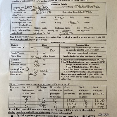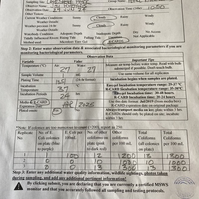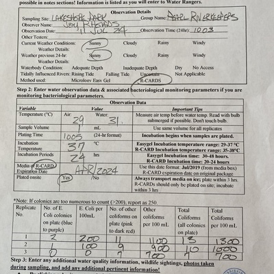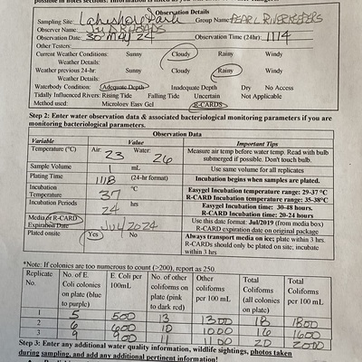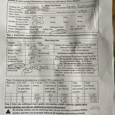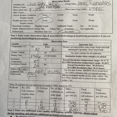 Lakeshore Park has data for previous_weather, current_weather, air_temperature, water_temperature, incubation_time, incubation_temperature, e_coli, other_coliform, total_coliform, previous_weather_description, current_weather_description, turbidity, alkalinity, flow, river_stage, oxygen, ph, and hardness from 27 April 2018 to 27 August 2025.