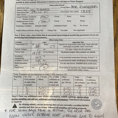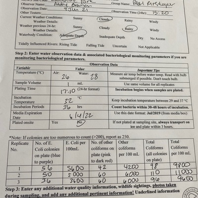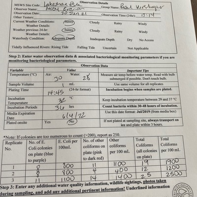 Lakeshore Park has data for previous_weather, current_weather, air_temperature, water_temperature, incubation_time, incubation_temperature, e_coli, other_coliform, total_coliform, previous_weather_description, current_weather_description, turbidity, alkalinity, flow, river_stage, oxygen, ph, and hardness from 27 April 2018 to 27 August 2025.