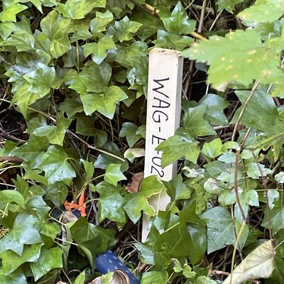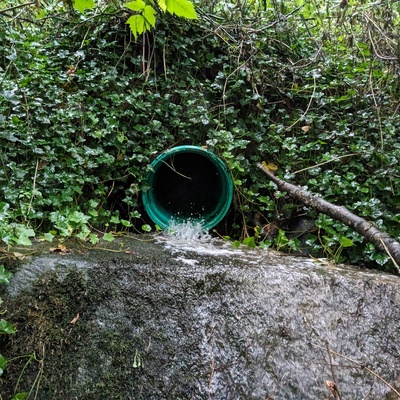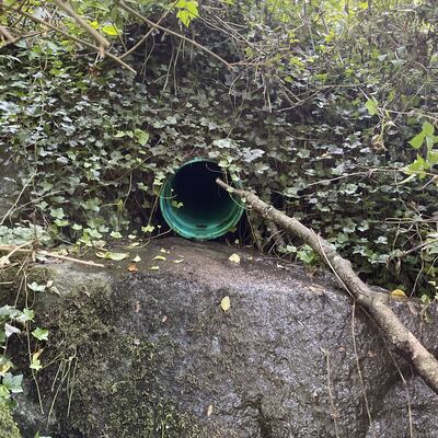 - location of WAG-E-02 using zoom on web app. This is where a green plastic storm pipe of 0.45m inside diameter surfaces in the bushes 5m south of the path leading from the creek to the west end of 14th St. It is just below the start of the staircase. From here it flows down the hill and joins Wagg just below a footbridge. Field measured GPS coordinates in NAD83 are -123.0879080, 49.32131496 in Long and Lat, or UTM 493,612E, 5,463,180N